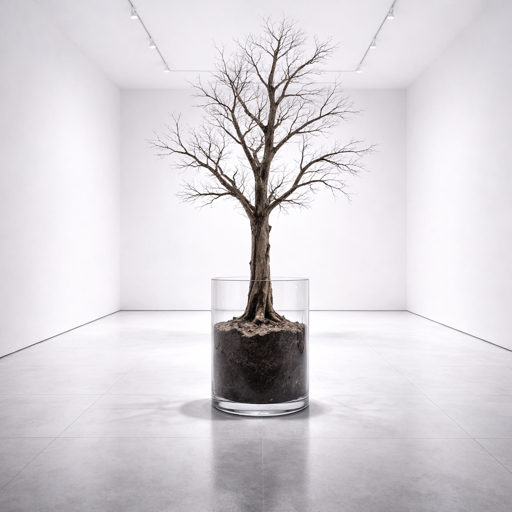 A dead tree enclosed within a glass vessel filled with soil, displayed in a sterile white space devoid of any living interference. The tree, an archetypal symbol of growth, connection, and rootedness, is here reduced to a specimen, a preserved artifact. It is no longer part of an ecosystem, but rather an isolated object, conserved like a laboratory sample.